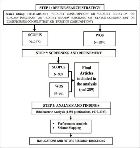 Due to considerations of understanding boundaries and upholding the study’s meticulousness, the filtering procedure incorporated explicit criteria for inclusion and exclusion (Lim et al., 2022b). First, only journal articles within the broader marketing realm and composed in English were encompassed. Second, our search scope was confined solely to journal articles, with conference papers, books, and non-peer-reviewed materials deliberately excluded from the database. Additionally, duplicate articles were eliminated through database filtration. Furthermore, the scrutiny extended to the title, keywords, abstract, and introduction segments to assess whether the emphasis revolved around “luxury consumption behavior.” Besides, even if a solitary study within an article explored the realm of luxury consumption in the marketing context, it was incorporated into the analysis. As a result of this inclusive approach, the implemented search queries effectively pinpointed a total of 1,289 documents that were published prior to August 10, 2023. This substantial dataset is a robust foundation for conducting a comprehensive bibliographic analysis, aligning with the methodology highlighted by Paul and Criado (2020).