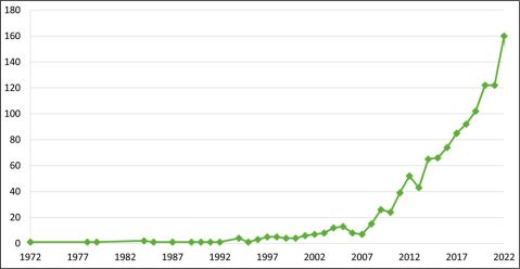 Figure 2. The Annual Publication Pattern of 1,289 Articles Collected from Scopus and Web of Science Spanning the Years 1972–2022.