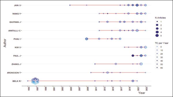 Figure 4 provides a visual representation of how influential authors have evolved over time in terms of their publishing and citation impact. The size of the bubbles in the graphic corresponds to the number of publications associated with each author, while the line graph illustrates the progression of an author’s publications over the years. The color intensity of the bubbles indicates the total yearly citations received.