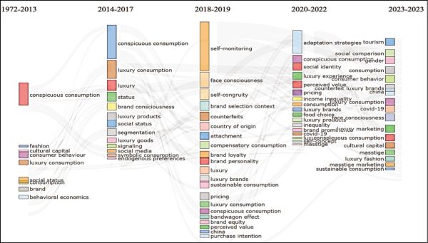 From 1972 to 2013, significant keywords that gained prominence included conspicuous consumption, consumer behavior, and luxury consumption. From 2014 to 2017, researchers delving into “luxury consumption behavior” underwent a noticeable shift in their focus, placing greater importance on conspicuous consumption, luxury consumption, luxury, status, brand consciousness, and luxury products. Between 2018 and 2019, there was an evident change in the research direction towards various domains, including self-monitoring, face consciousness, counterfeit, and brand selection. From 2022 to August 2023, noteworthy areas of interest have emerged, covering topics such as adaption strategies, perceived value, social identity, and luxury experience.