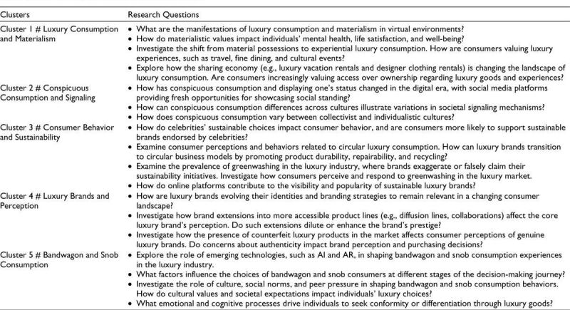 Our study, which connects diverse clusters of themes, is poised to propel the field forward by illuminating the current landscape of knowledge and initiating a discourse on the future trajectory of research. Scholars are embracing this paradigm shift and aligning their studies with more comprehensive and profound dimensions of luxury consumption. Nevertheless, most research has concentrated on luxury fashion, jewelry, and accessories (Grotts & Johnson, 2013; Phau & Cheong, 2009; Turunen & Leipämaa-Leskinen, 2015), whereas domains of higher involvement, such as luxury residences, automobiles, and yachts, remain relatively unexplored. Although luxury goods have garnered substantial scholarly attention, luxury services have received limited investigation (Klaus & Tarquini-Poli, 2022). However, there exists significant potential for solidifying service theories and conceptual frameworks. In conclusion, having thoroughly identified the outcomes of research endeavors, we propose potential avenues for future investigations, along with insights into each thematic cluster.