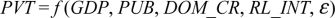 where PVT represents private infrastructure investment, GDP represents the gross domestic product, PUB represents public infrastructure investment, DOM_CR represents domestic credit provided to private sector, RL_INT represents the real interest rate, and e represents the error term.