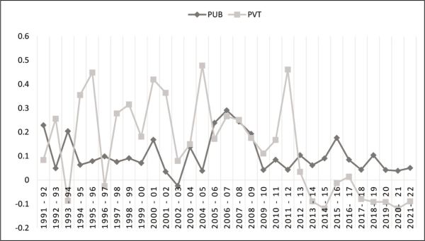 For sustainable growth in the economy, the presence of private investment must be ensured to complement public investment. Public investment, to a large extent, depends on the perspectives of the ruling government. Their ideologies will prioritize the areas and the volume of investment. As the economy grows, investment by the public sector cannot bear alone all the financial burden needed for developmental activities (Varshney, 2008). There comes the private investment, which pools together the investments of individuals and invests in productive purposes. Boosting private investment as an alternative source of financing is a vital step taken by many developed countries to solve the resource crunch. However, traces of this paradigm shift are visible in India only after 1991.