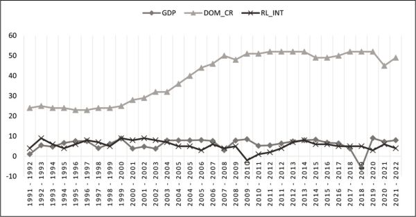 Figure 2. Trend Analysis of GDP, Domestic Credit to the Private Sector and Real Interest Rate in India.