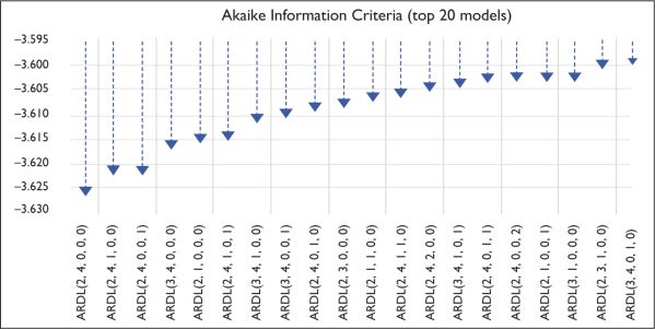 For analyzing the results of the ARDL model, the selection of optimal lag length is necessary. The time-series analysis is sensitive to the lag length of the model. Out of the several model selection criteria for estimating the lag length, Cherkassky and Ma (2003) suggest AIC as the best. This is because it yields superior predictive performance in model selection compared to others. Figure 3 represents AIC values of the top 20 models. Among these, the model showing the lowest AIC is selected as the optimum lag length of the model. The model with the smallest AIC value of –3.6262 is ARDL (2, 4, 0, 0, 0). So, this lag length can be considered as the optimum lag length for the model.