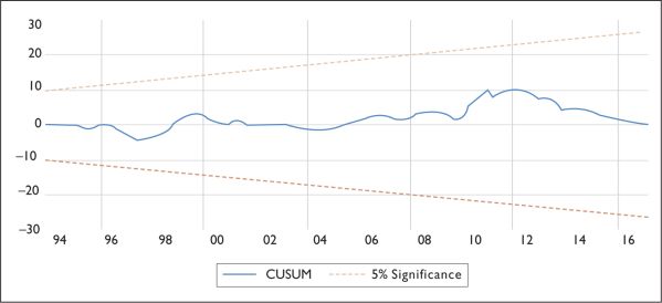 Like residual diagnostics, stability diagnostics is equally important for checking the adequacy of the model. The Ramsey test and CUSUM test are used here to check the stability of the model.
