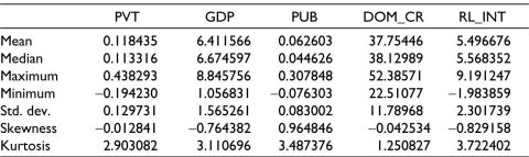 Other variables, namely, GDP (in real terms), domestic credit to the private sector as a percentage of GDP, and real interest rates (which is adjusted for inflation using the GDP deflator), were collected from the World Development Indicators published by the World Bank. All variables were measured in growth rates except domestic credit to the private sector and real interest rate (which was already available in percentages). As only year-wise data were available, it was converted to quarterly data for increasing the number of observations for analysis. The linear method was used for the conversion. Data analysis was done in the EViews software.