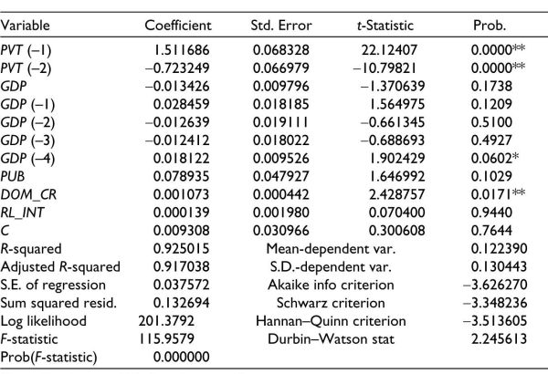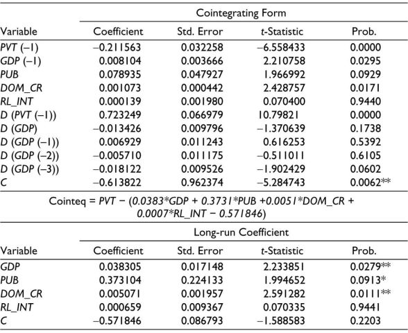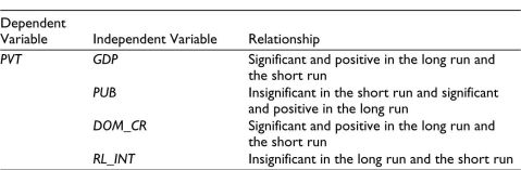 Table 3 shows the short-run coefficients of the ARDL model run between private infrastructure investment and its various determinants in India. While studying the relationship between the variables in the short run, it was found that the probability values of short-run coefficients of two macroeconomic variables, that is, GDP (lagged values) and domestic credit to the private sector, are statistically significant at 10% and 5%, respectively. The relationship with GDP was in accordance with prior expectations, that is, there is a positive impact of GDP on private infrastructure investment in the short run. This finding also supports the findings of many studies, such as Jalloh (2014), Augustine (2014), and as literature seldom contradicts with the impact of GDP over investment.