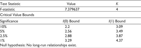 After estimating the short-run coefficients under the ARDL method, the long-run relationships among the variables are checked using the bound test. The result of the bound test is given in Table 4.