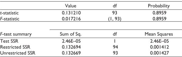 Table 8 presents the result of the RESET test, that is, the regression specification error test (Ramsey, 1969) for the model. This test helps to check whether the model is well specified and not omitted significant variables. For the model to be adequate, the probability value should be greater than the 5% significant level. Here, the value is 0.8959, which is satisfactory.