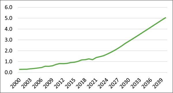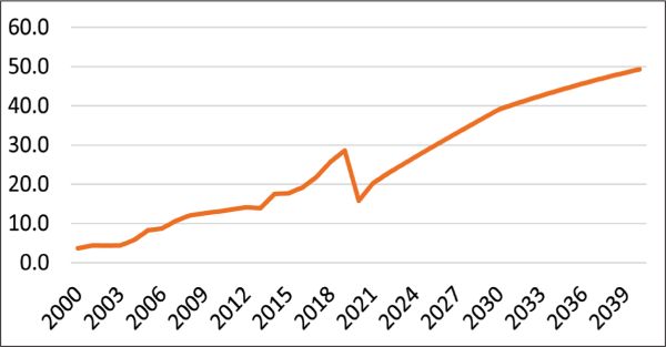 As Figure 1 shows, per capita consumer spending in India shows (and is also expected to show) a discernible upward trend from 2000 to 2040 as per Statista (2024). The same would translate into higher purchases of luxury goods, with increasing disposable incomes and a dynamic, young population (Statista, 2024). Another key indicator of luxury, international tourism expenditure, also shows an upward trend, based on actual and extrapolated values for 2000–2040 (Statista, 2024). The same depicts affluence in the Indian society. Figure 2 shows the graph for international tourism expenditure in the country.