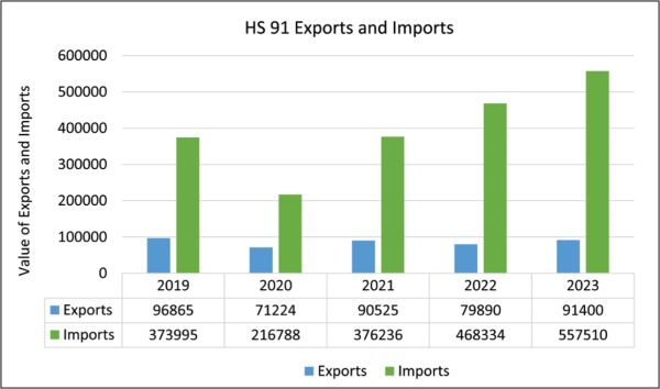 Figure 10.India’s Export–Import Trends in HS 91 (Luxury Watches).