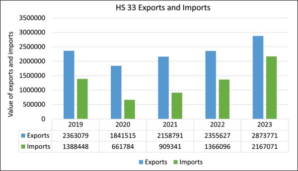 Figure 3. India’s Export–Import Trends in HS 33 (Luxury Cosmetics and Fragrances).