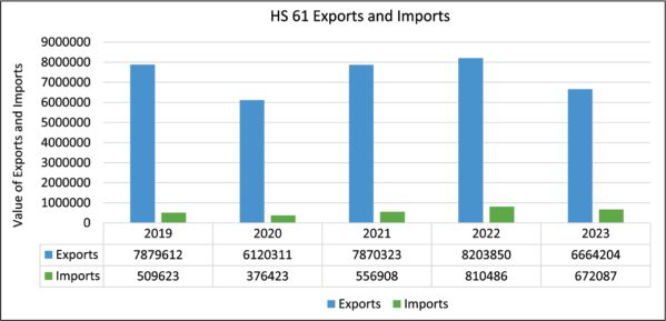 Figure 5. India’s Export–Import Trends in HS 61 (Articles of Clothing and Apparel, Knitted or Crocheted; a Sub-category of Luxury Apparel).