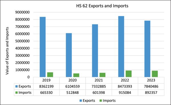 Figure 6. India’s Export–Import Trends in HS 62 (Articles of Clothing and Apparel, Not Knitted or Crocheted; a Sub-category of Luxury Apparel).
