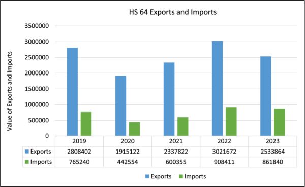 Figure 7.India’s Export–Import Trends in HS 64 (Luxury Footwear).