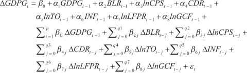 The ARDL model for the standard log-linear functional specification of long-run relationships among the dependent and independent variables may follow as: