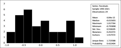 As shown in Table 7, the F-statistic is 1.48 with a corresponding probability (Prob. F) of 0.27, while the Obs × R2 value is 21.07 with a p value of .28. Additionally, the Scaled Explained Sum of Squares (SS) yields a value of 1.15 with a p value of 1.00. Since all p values are well above the conventional significance levels (i.e., 0.05 or 0.10), we fail to reject the null hypothesis of homoskedasticity. This indicates that there is no significant evidence of heteroskedasticity in the model, meaning that the variance of the residuals is constant. As a result, the model satisfies the classical linear regression assumption of homoskedasticity, supporting the reliability of standard errors and statistical inference.