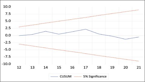 In both cases, the test statistics remain well within these bounds throughout the sample period. This outcome strongly suggests the absence of structural instability or any significant break in the underlying data-generating process of the GDPG equation. The stability of the coefficients over time reinforces the reliability and robustness of the model. In practical terms, this implies that the model’s estimated parameters do not fluctuate erratically due to changes in the underlying economic structure, making it suitable for both short-run and long-run policy analysis. The confirmation of parameter stability through these tests enhances confidence in the empirical findings and supports the validity of the conclusions drawn from the model.