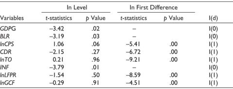 As a preliminary step in the empirical analysis, this study conducts unit root tests to assess the stationarity properties of the variables included in the model. In this research, the ADF test is employed to determine the order of integration of each variable -that is, whether a variable is stationary at level [I(0)], or becomes stationary after first differencing [I(1)]. This step is particularly important because the ARDL bounds testing approach developed by Pesaran et al. (2001) requires that none of the variables be integrated of order two [I(2)] or higher. The ARDL model is uniquely suited to analyse relationships among a mix of I(0) and I(1) variables, allowing for both short-run dynamics and long-run equilibrium relationships to be captured within a single estimation framework.