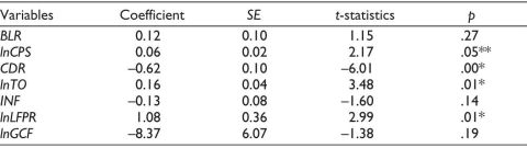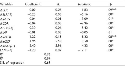 t – 1 is the lagged error correction term,This equation captures how each of the variables (BLR, credit to the private sector, CDR, trade openness, INF, labour force participation rate, and gross capital formation) adjusts over time in response to changes, while also adjusting to restore the long-term equilibrium relationship, as indicated by the ECM.