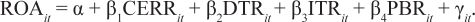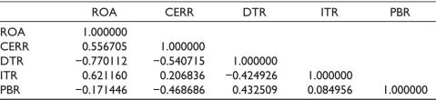 The correlation matrix for the period of study clearly shows that ITR and CERR are positively correlated with ROA, while PBR and DTR are negatively correlated with ROA. In the study, it is also found that DTR is moderately correlated with PBR with a correlation coefficient of 0.432, indicating that debt to equity is correlated with price and book value. ITR is slightly correlated with PBR, and CERR is negatively correlated with PBR, indicating that cash retention and price to book value cannot go side by side.