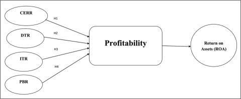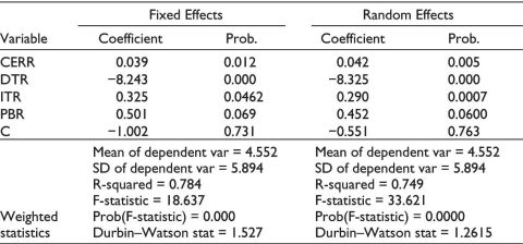 The Hausman test (Table 6) has selected the random effect model for the period, which reports an R-squared value of 74.92% and an adjusted R-squared of 72.70% with an F-statistic value of 33.62% and probability (F-statistics) is 0.00, indicating that the coefficient of determination resulting from the model is significant, where 74.92% of the variation in ROA, used as a proxy for profitability, is explained by the significant explanatory variables included in the model. As per the results shown in Table 5, CERR, ITR and PBR have a positive and significant impact on ROA at a significance level of 5%, 5% and 10%, respectively. DTR has a negative and significant impact on ROA at a significance level of 5%.