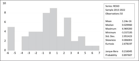 For the above panel data regression analysis, the normality of residuals is examined with the help of normal quantile–quantile plots (Q–Q plots), and it is presented in Figure 2. Further, the robustness of the normality of data is performed through the Jarque–Bera test in Figure 3, which favours the null hypothesis indicating the sample to be normally distributed (Jarque & Bera, 1987), a normal distribution as presented for the residual, along with the residual of the specification conform and along with it the normal Q–Q plots of the residuals.