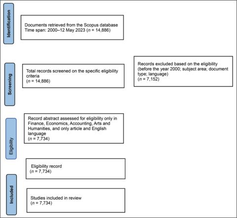 Screening: Due to the small number of articles published prior to the year 2000, we exclude them from the screening process. Furthermore, we have chosen to include only review articles/papers in English, and the publication must be in the fields of ‘Economics’, ‘Econometrics’, ‘Finance’, ‘Business Management’, ‘Accounting’, ‘Social sciences’, and ‘arts’. In this phase, 7,152 documents were eliminated based on the application of predetermined criteria, and a total of 7,734 articles and studies were found relevant.