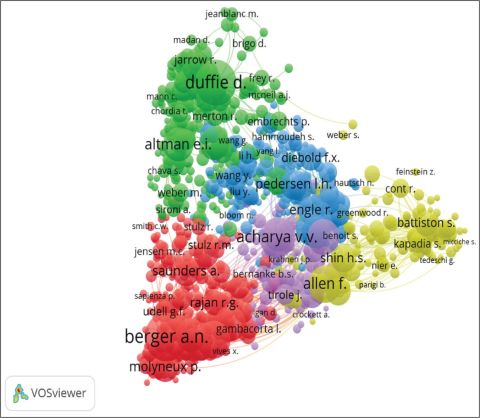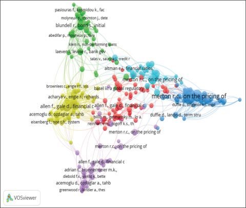 The yellow cluster is the fourth cluster, which includes studies ‘Systemic risk in financial systems’ (Eisenberg & Noe, 2001), ‘Capital shortfall: A new approach to ranking and regulating systemic risks’ (Acharya et al., 2012) and many more. Fifth cluster is the purple cluster includes studies like ‘Systemic risk and stability in financial networks’ (Acemoglu et al., 2015), ‘Measuring systemic risk’ (Acharya et al., 2017), etc. and last cluster is sky-blue cluster which contains studies ‘The pricing of options and corporate liabilities’ (Black & Scholes, 1973), ‘Financial ratios, discriminant analysis and the prediction of corporate bankruptcy’ (Altman, 1968) and others.
