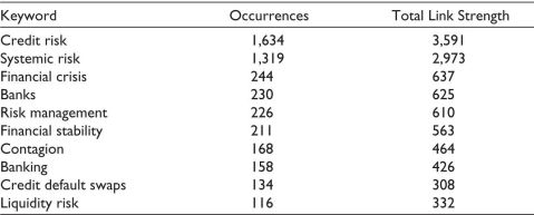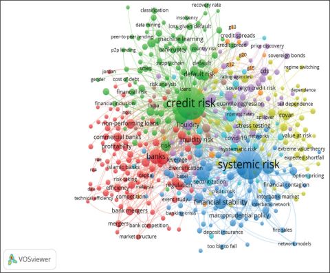 To facilitate analysis, the authors constructed a keyword co-occurrence map utilising the terms they provided. Table 6 presents a compilation of keywords that are found within a proximity of five instances of each other, accompanied by their corresponding thresholds. Out of the total of 13,538 keywords, only 972 keywords were able to meet the requirement. It was inevitable that the term ‘credit risk’ would have the most occurrences, given that the purpose of this study is to identify credit and systemic risk in the domain of bank mergers. Credit risk was mentioned 1,634 times in the articles, with a total linkage strength of 3,591. This illustrates the heightened academic curiosity about credit risk in bank mergers, which promotes fresh investigation in the aforementioned area. Systemic risk emerged as the second most frequently encountered term, with a total link strength of 2,973 and 1,319 occurrences. Followed by financial crises exhibiting a total link strength of 637 and 244 occurrences. Additional terms in the top 10 keywords list were ‘banks’, ‘risk management’, ‘financial stability’, ‘contagion’, ‘banking’, ‘g21’ and ‘liquidity risk’.