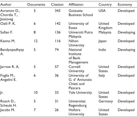 As a criterion for identifying highly influential authors, the authors of at least five publications with a minimum of five citations were selected. 13 out of 7,204 authors satisfy the criteria. Table 3 presents a compilation of authors who have garnered the highest number of citations for their published research on bank mergers. The individuals Avramov D., Chordia T., and Jostovag have made the highest number of contributions, with a total of five documents and 343 citations. Following closely is Ozili P. K., who has received six documents and 142 citations. On the other hand, it is noteworthy to mention that Kanno M. has emerged as the most prolific author in the domain of bank mergers, with a cumulative publication count of 12 documents. However, their work was less cited than that of others.