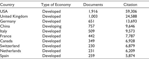 Table 4 presents the citations categorised by nations, with a criterion of at least 5 documents and 10 citations, revealing that only 86 of the 246 countries met the condition. Table 4 displays the world’s 10 most prominent and cited nations. In the categories of documents (1,916) and citations (59,306), the United States, a country with a ‘developed’ status, came in first. In addition, the United Kingdom ranked second with 1,003 documents containing 24,588 citations, followed by Germany, China, and others.