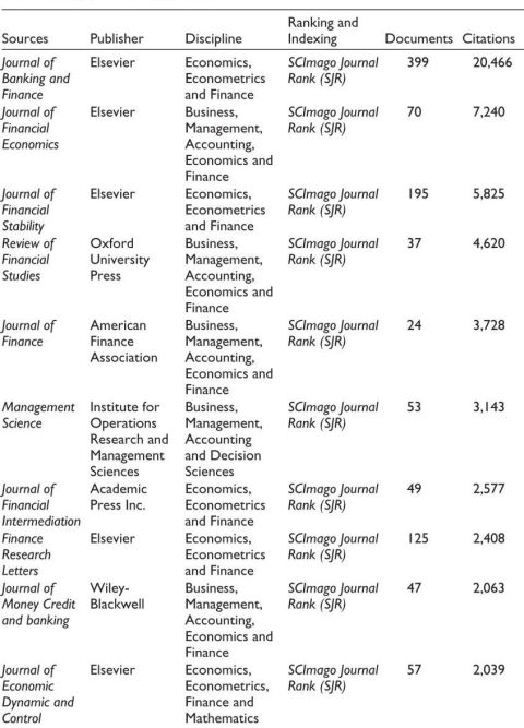 From sources containing at least five documents and at least five citation sources, a comprehensive citation map was generated. There were only 13 sources out of 189 that fulfilled the criteria. Table 5 lists the top 10 journals with the most citations. The Elsevier publication Journal of Banking and Finance has the highest impact factor, with 20,466 citations over 399 documents, and is ranked with SCImago Journal Rank (SJR). The second most cited publication was Elsevier’s Journal of Financial Economics, a multidisciplinary journal with 7,240 citations and 70 documents cited. Elsevier’s Journal of Financial Stability contains 5,825 citations and 195 documents in total.