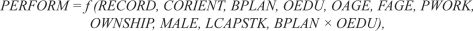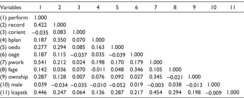 where PERFORM denotes firm financial performance, serving as the dependent variable. RECORD represents the status of record-keeping, and CORIENT captures the degree of customer orientation. BPLAN indicates whether the firm has a formal business plan, while OEDU refers to the education level of the owner. OAGE and FAGE denote the age of the owner and the firm, respectively. PWORK represents the number of paid workers. OWNSHIP refers to the ownership structure of the firm, and MALE is a binary variable indicating whether the manager is male. LCAPSTK denotes the natural logarithm of the firm’s capital stock. The interaction term (BPLAN × OEDU) captures the moderating effect of owner education on the relationship between business planning and firm performance.