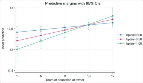 The positive moderating effect of education on the relationship between business planning and firm performance suggests that education enhances an owner’s capacity to transform plans into effective actions. In the context of small firms in Bangladesh, formal education likely equips owners with better analytical, organisational and strategic management skills, enabling them to utilise business plans more effectively. Conversely, less educated owners may lack the technical and managerial expertise required to translate planning into improved performance outcomes. This finding highlights managerial capability as a mechanism through which education enhances the benefits of business planning. Overall, it demonstrates a classic moderation effect, where education strengthens the impact of business planning on firm performance.
