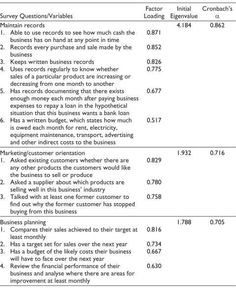 The survey offers a representative sample of firms defined by specific size thresholds, with the firm (specifically, SMEs) serving as the unit of analysis. Twenty-six questions evaluated core business practices employed in daily operations, including marketing, purchasing and inventory control, costing and record-keeping and financial planning.
