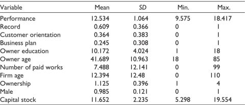 This study includes control variables that are theoretically and conceptually justified as relevant determinants of firm performance. Firm age, measured by the number of years in operation, is considered a control variable as consistent with prior studies (e.g., Coad et al., 2018). Firm size, proxied by the number of paid employees, is included to account for size-related effects commonly observed in small firm performance studies (e.g., Stam & Elfring, 2008). The owner’s age in years serves as a proxy for managerial experience, which has been shown to positively influence business performance (Gielnik et al., 2017). Owner education, measured as total years of formal schooling (ranging from 0 to 20 years), is included both as an independent variable and as a moderator assessing the impact of business strategy on performance. Next, ownership structure is controlled for given evidence that ownership type may affect firm growth and performance (Davidsson & Henrekson, 2002). Finally, in line with the standard production theory, particularly the Cobb–Douglas production framework, the logarithm of capital stock is included as a control variable to account for variations in firms’ productive capacity and scale, thereby mitigating potential bias arising from differences in capital intensity (Bloom & Van Reenen, 2007).