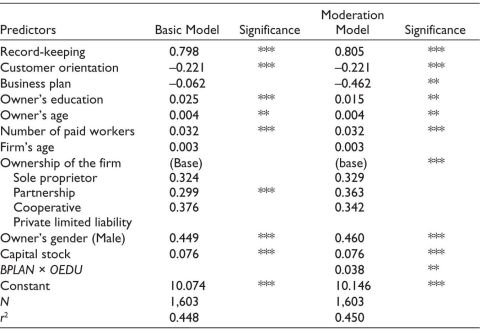 The regression analysis comprises two specifications: the basic model and the moderation model, the latter introducing an interaction term between business planning and owner’s education (BPLAN × OEDU). Table 4 presents the regression results from both models.